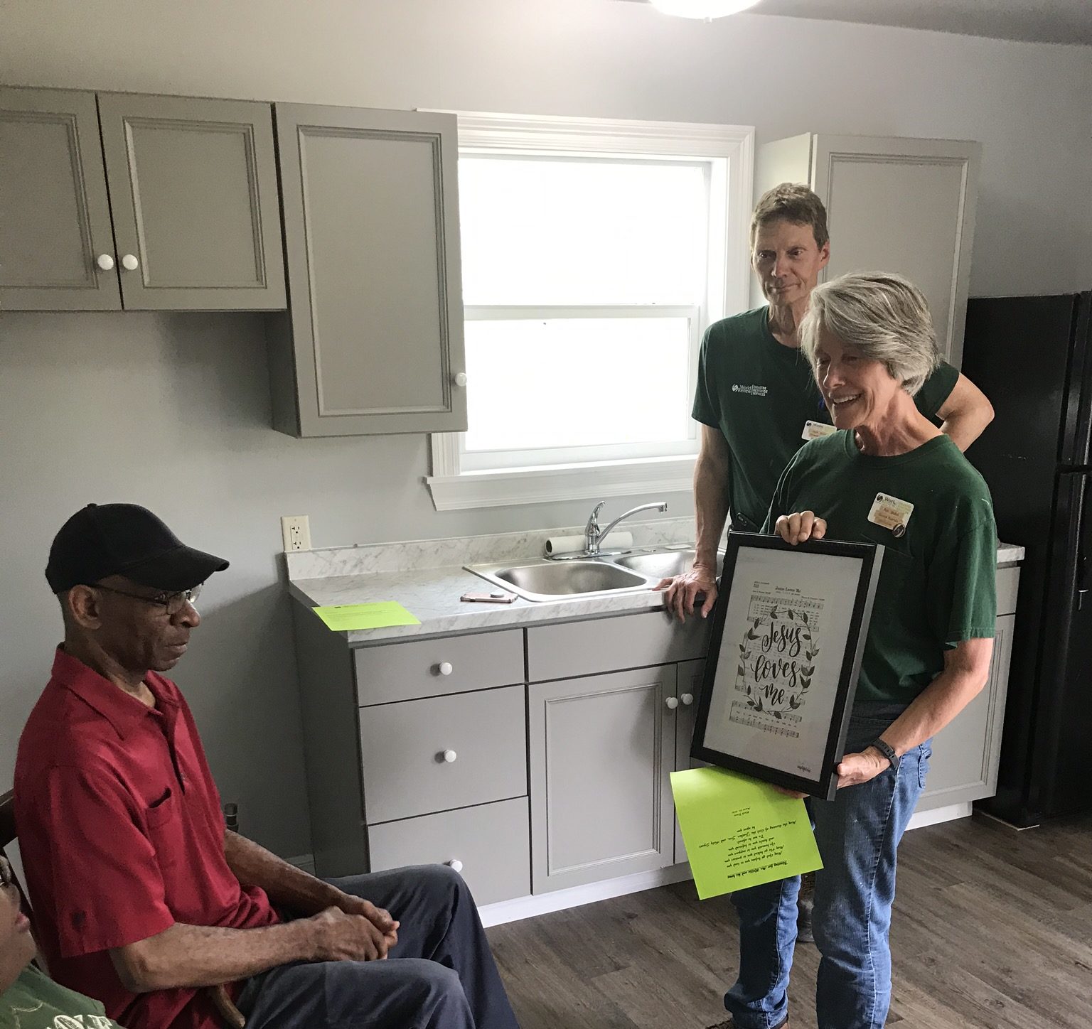 Mr. Willie presented with a wall hanging for his kitchen by members of World Renew.